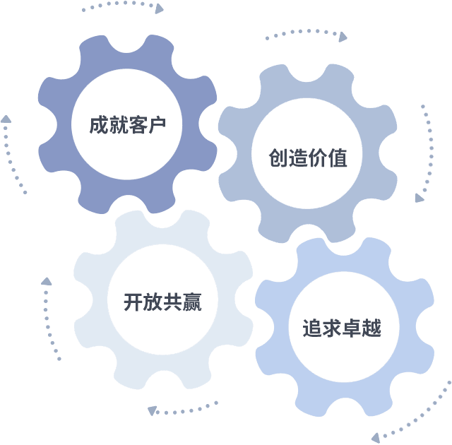 成就客户是一切决策的出发点,,,,创造价值是衡量所有工作的标准,,,追求卓越是我们做事做人的态度,,,,开放共赢是我们的格局也是最终的结果。。。价值观的齿轮环环相扣,,推动着组织里的每个人不断向前。。。